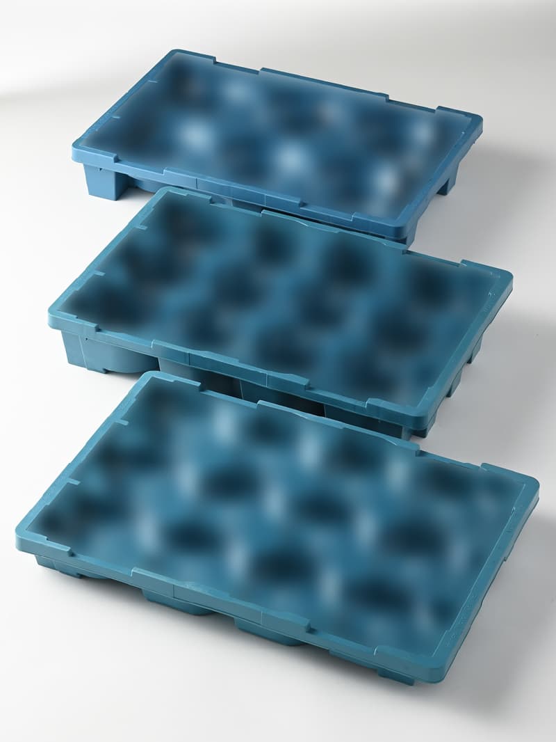 - 今から数年前、アオノはユニークな試みに挑んでいた。自動車の輸出部品を、種類ごとに確実かつ安全に固定し、なおかつ輸送コストの削減にも寄与する梱包輸送容器の開発だ。積み上げた経験値と、アオノが誇る真空成型の技術をもってすれば、実現できる見込みがあった。企画開発において常に協力関係にある取引先の助力も、大きな支えとなった。